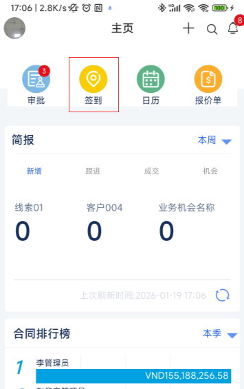 该主页是为公司领导层专属定制的运营情况仪表板,集中呈现本年度的核心销售业绩与业务健康度。可视化图表实时汇总签约与回款达成率,直观展示销售漏斗各阶段的商机数量,并提供销售员排名、回款排名及大客户贡献排名等关键榜单,帮助管理者快速把握整体业务态势,支撑精准决策。