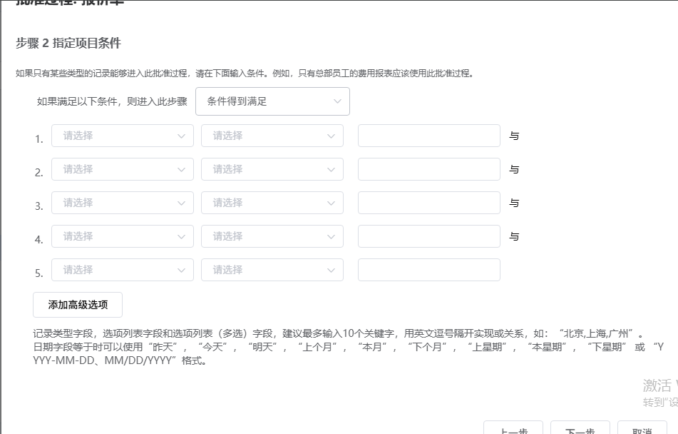可在审批流程步骤中设置记录条件,符合条件时走该审批流程,若不填写则所有记录都可走该流程。(例如,设置某个范围的权限比例,仅该范围的记录可走此审批流程)