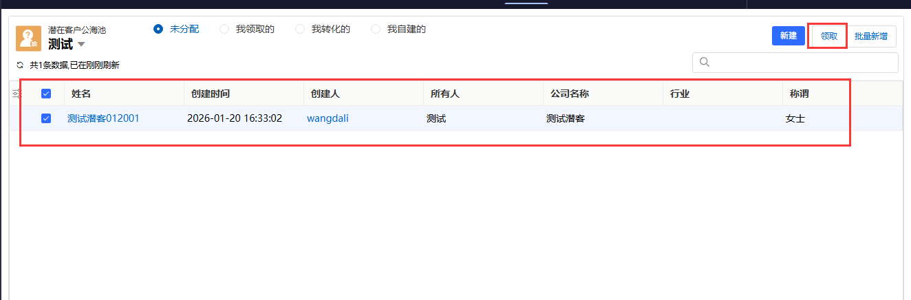- 领取线索:选中一条或多条目标线索,点击列表上方的「领取」按钮。线索将自动分配至你的名下,并移出公海池。