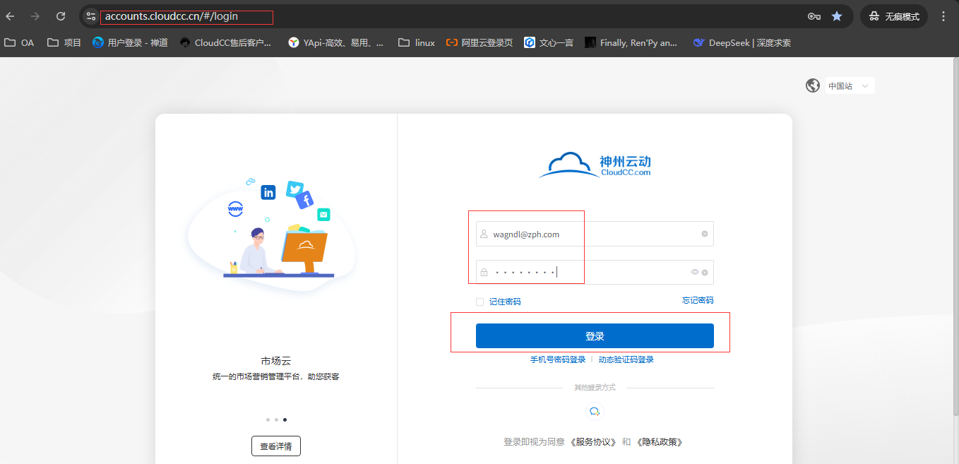 打开浏览器,输入系统的地址:https://accounts.cloudcc.cn/#/login,回车跳转,系统弹出登录界面,如图所示: