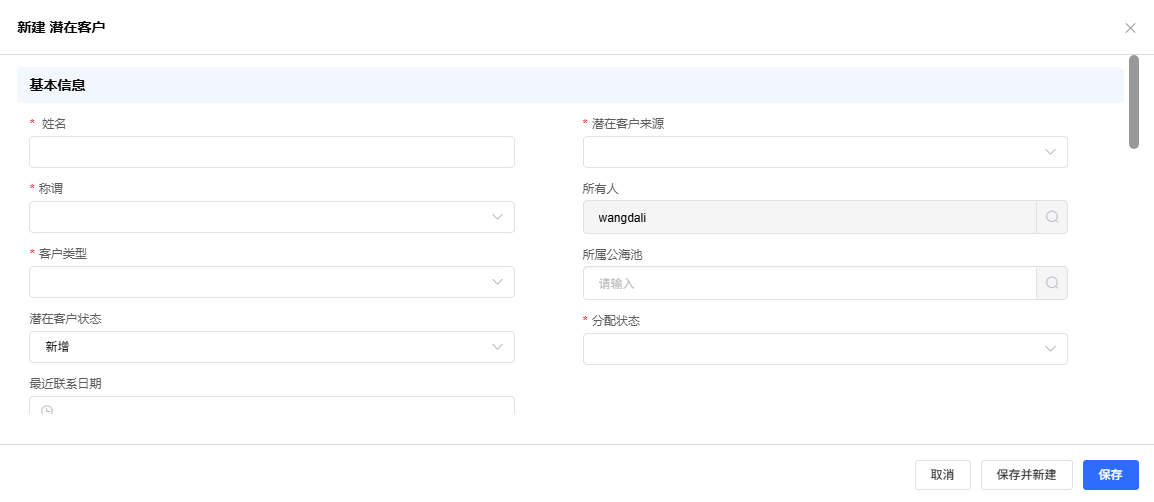 - 完成创建:检查所填信息无误后,点击表单底部的「保存」按钮。保存成功后,页面将自动跳转至该潜在客户的详情页。
