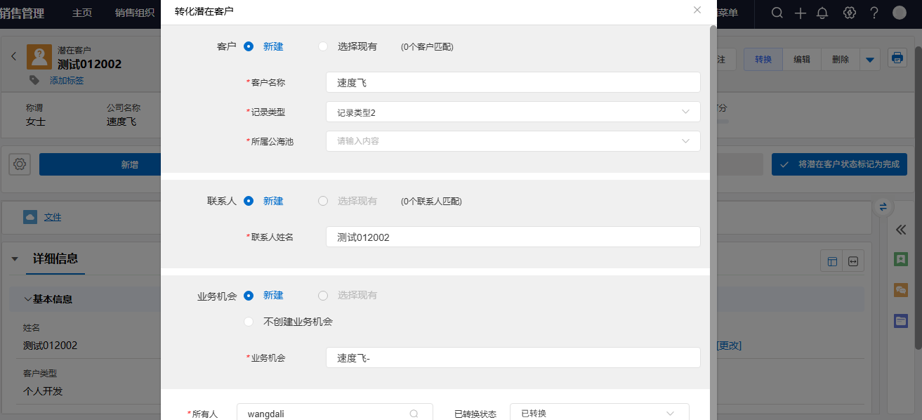 - 完成转换:确认所有信息无误后,点击转换窗口的「确认」按钮。系统将自动执行转换,原潜在客户记录状态将更新(标记为“已转换”),并跳转到新创建的客户、联系人(如新建)的详情页。