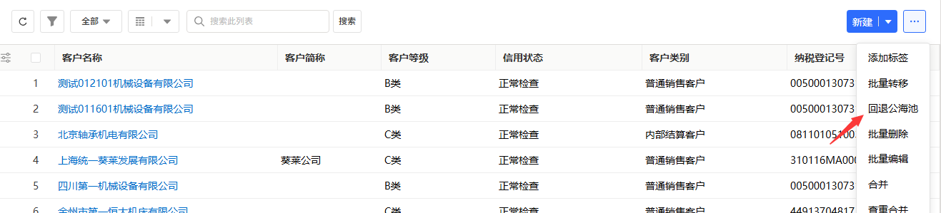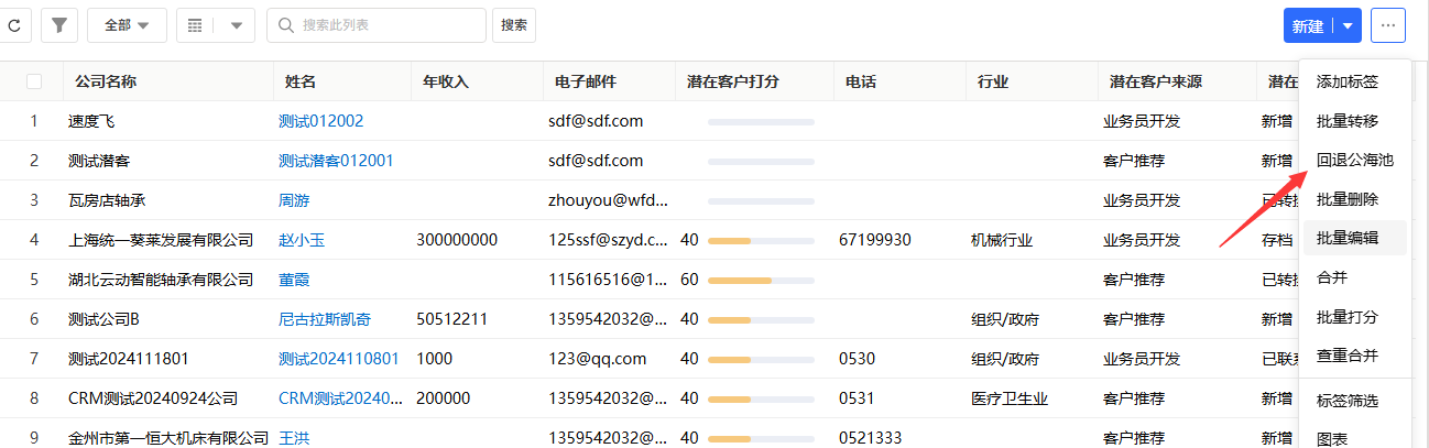 - 在列表右侧的「操作」栏中,找到并点击「回退公海池」按钮。