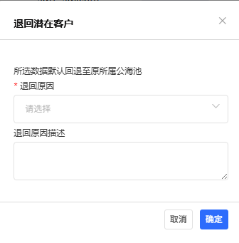 功能概述:将当前由自己负责但暂时无法跟进或无价值的潜在客户,主动退回至公共的客户资源池(公海池),以便其他销售代表重新领取跟进。适用于销售代表因客户无效、长期未成交或业务范围调整等场景。主要目标用户为销售代表与销售团队管理员。
