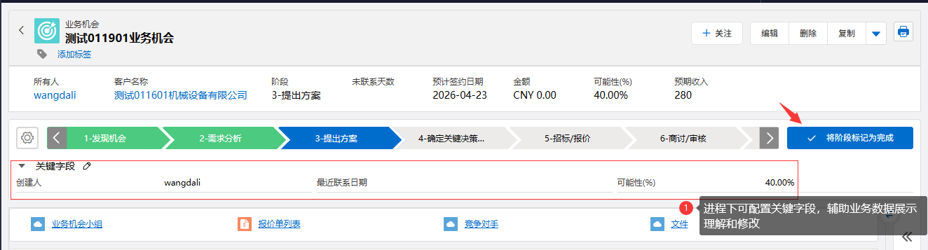 功能概述:用于销售代表在完成对潜在客户的一次关键跟进(如:产品演示、报价发送)后,在系统中记录该进展,并将该次跟进任务或阶段状态标记为完成。此操作有助于清晰跟踪销售流程,并可能自动推进客户到下个阶段。