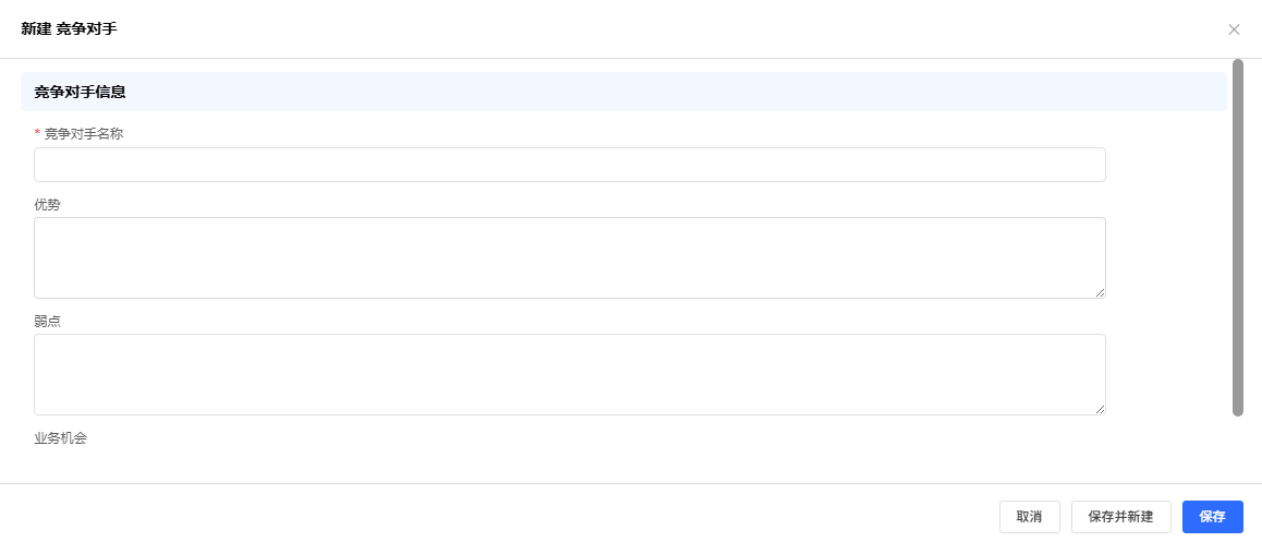 功能概述:用于首次在系统中记录从外部获取的客户线索,将潜在的业务机会转化为系统内可跟进、可管理的记录。适用于销售岗初次录入从展会、网络咨询等渠道获取的客户信息,或客服岗记录新的产品咨询客户。