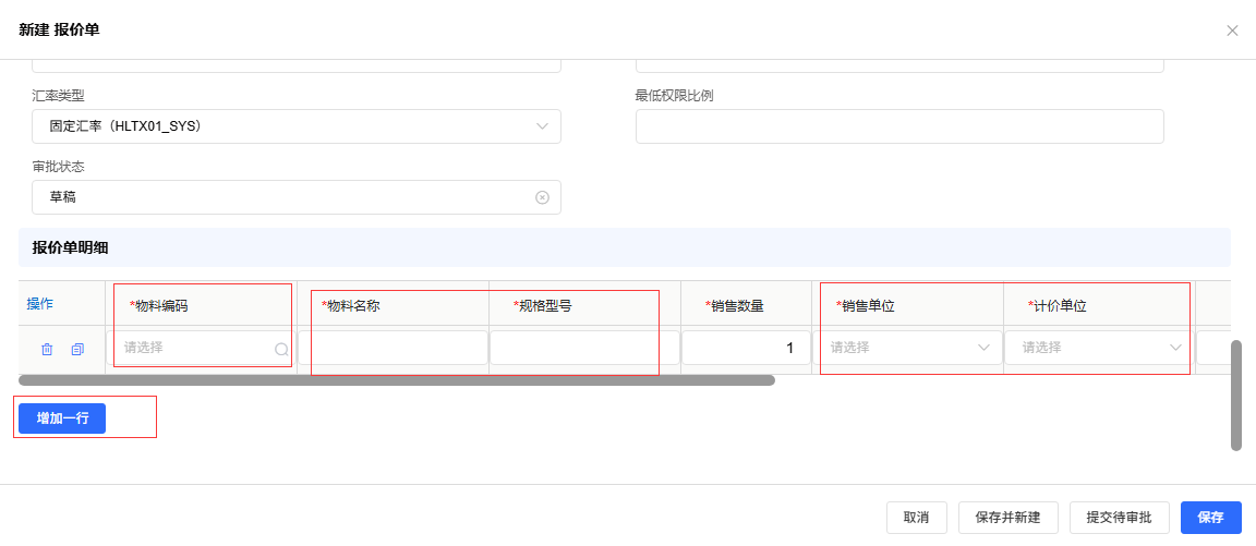 - 在表单中填写物料的必填及关键信息,通常包括: