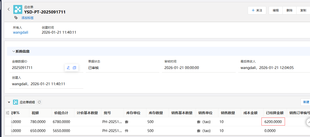 实际完成:应收单的 已结算金额
