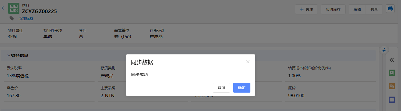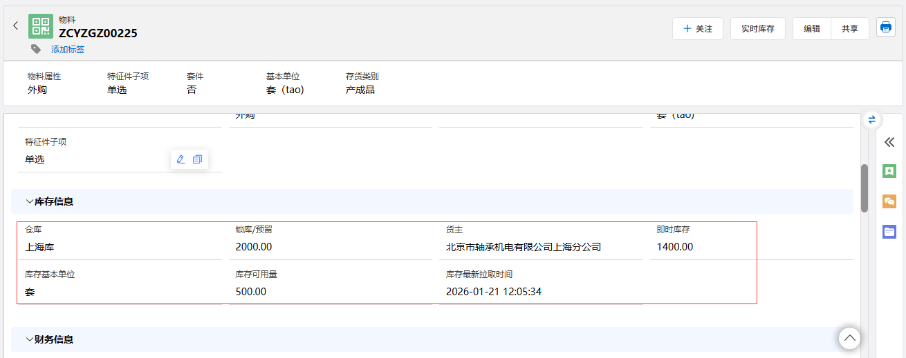 若与ERP关联,完成物料新建并保存后,进入物料详情页。在该页面中,设有“实用库存”按钮,点击此按钮可实现以下功能: