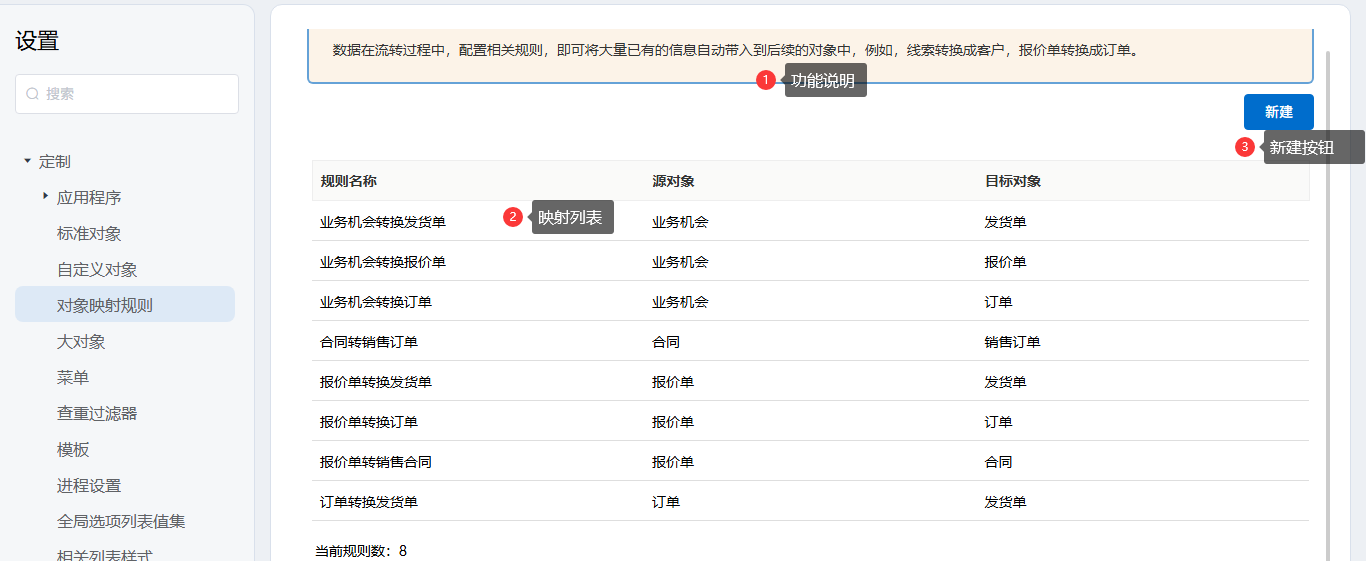 功能入口:后台设置→定制→对象映射规则。