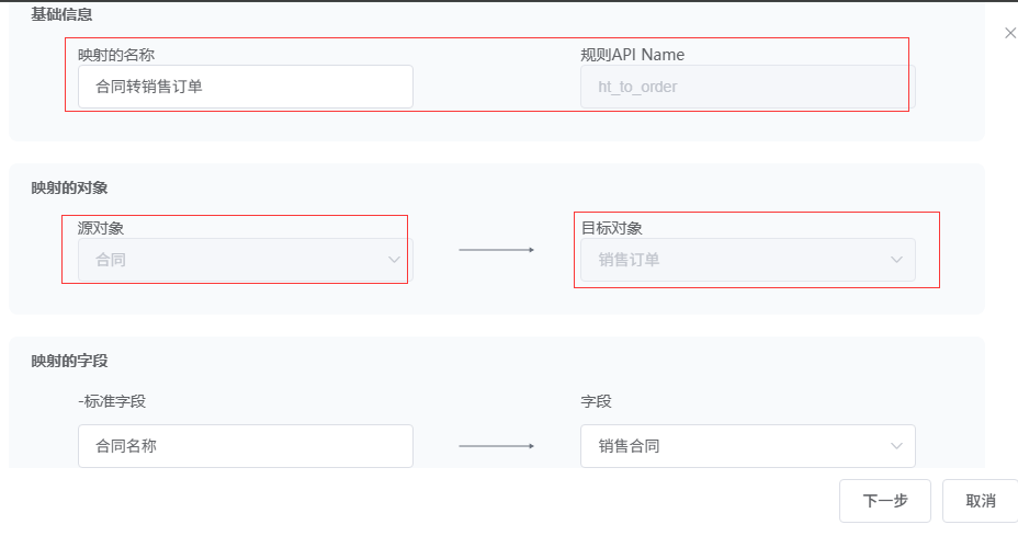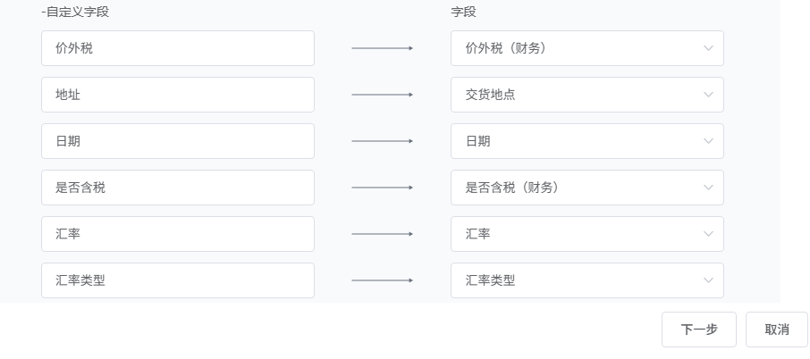 下滑选择映射字段,根据字段性质分为标准字段和自定义字段。左侧为源对象字段,只读,右侧展示目标对象字段,下拉菜单仅展示与左侧字段类型一致的目标对象字段。