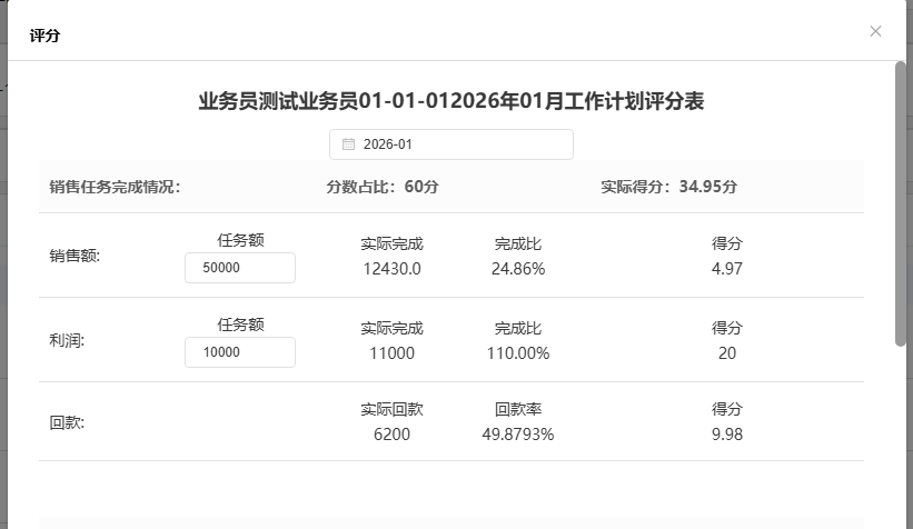 - 系统将弹出评分窗口,自动获取当月的任务额