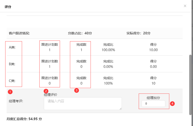 ④经理加分:手动输入,分值添加到客户跟进情况实际得分中,为空会导致预览错误