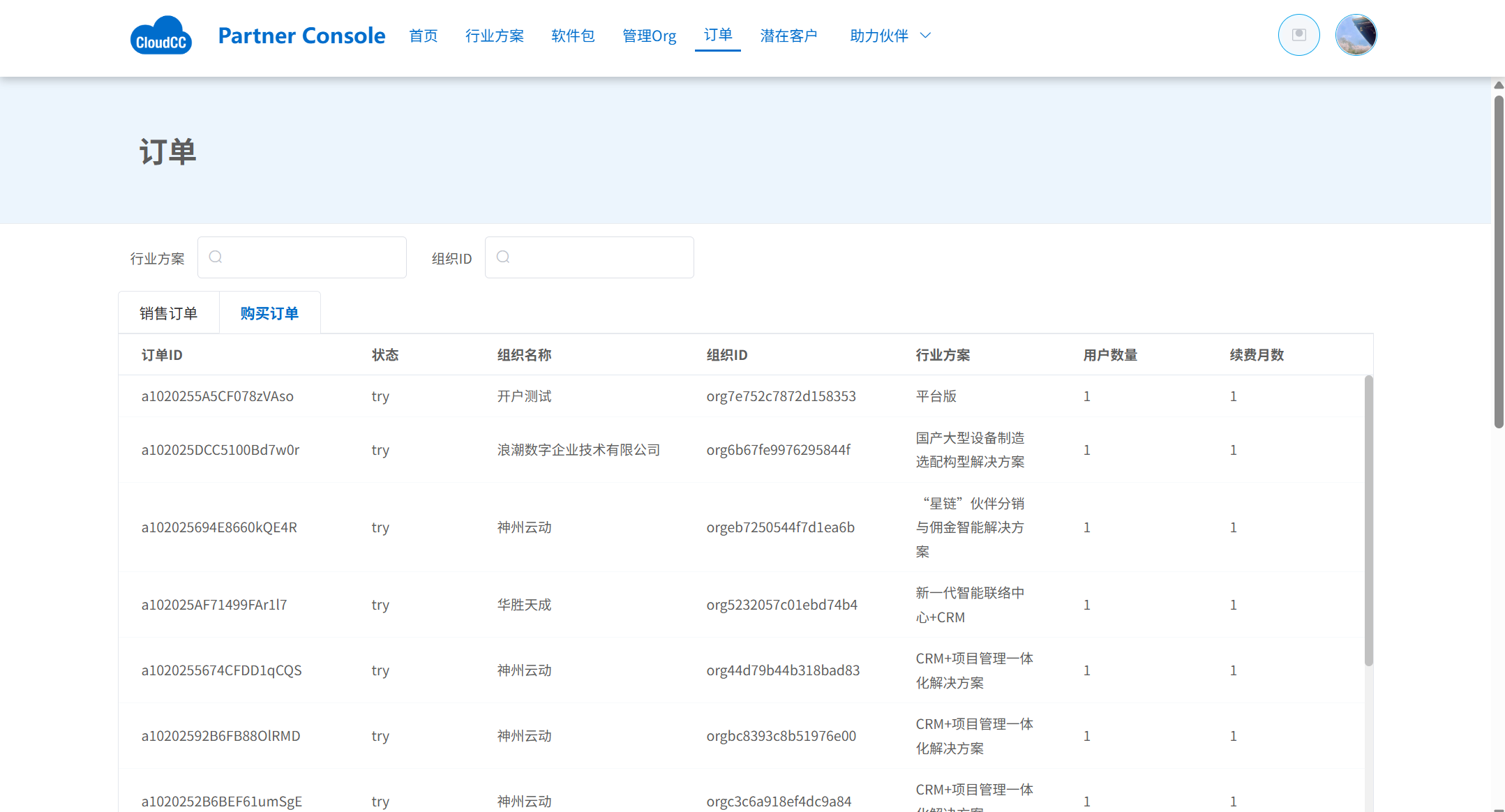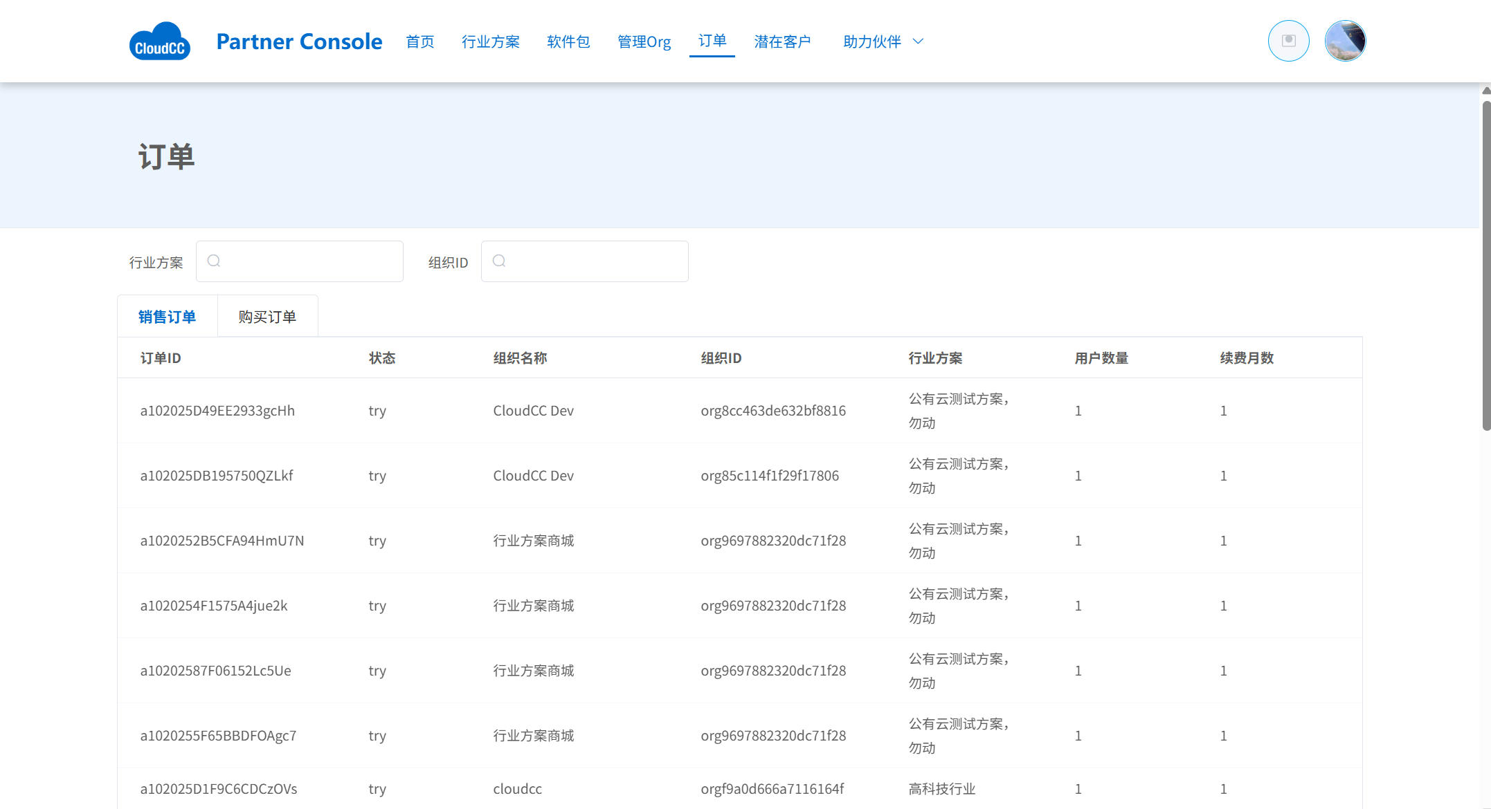 生态合作 8-订单管理 伙伴可以在此模块查看最终用户的支付记录以及伙伴购买CloudCC的购买订单记录1.销售订单这里展示的是最终客户,通过线上续订的订单记录(国内不支持最终客户线上续费)2.购买订单这里展示的是伙伴购买CRM许可的订单记录,支付发票申请。 Previous Next