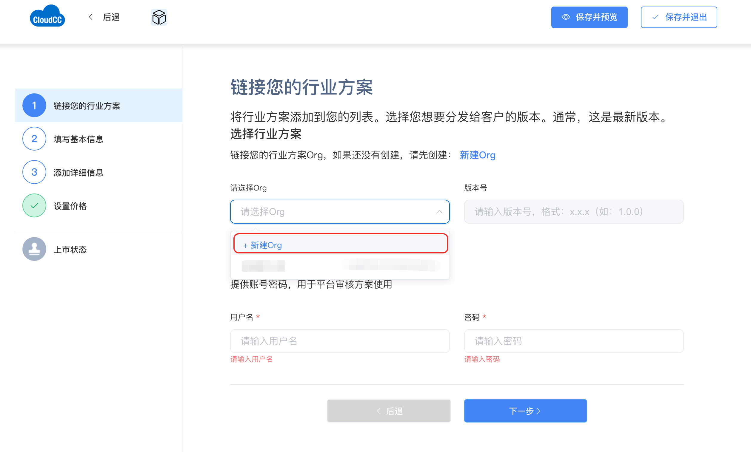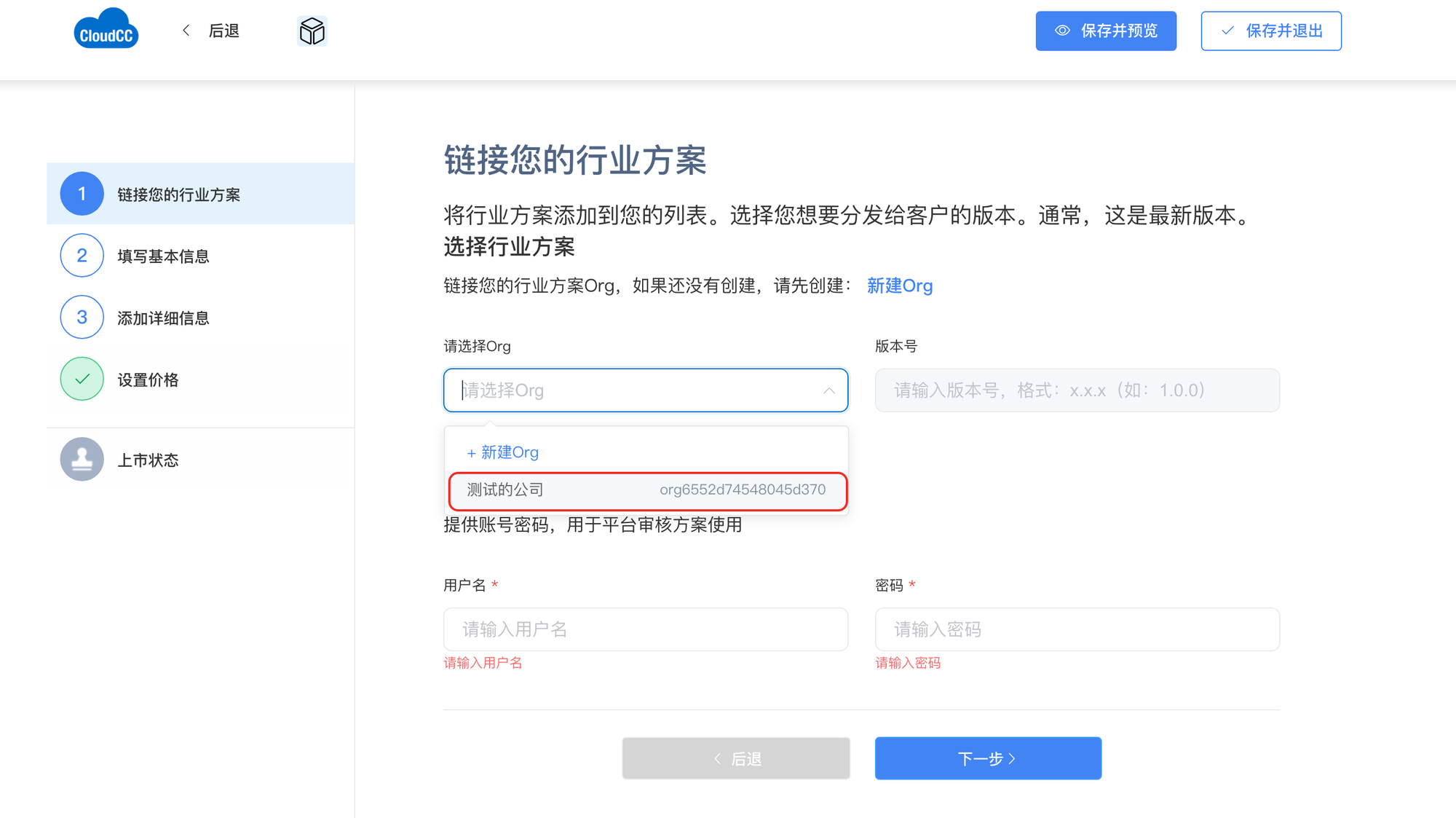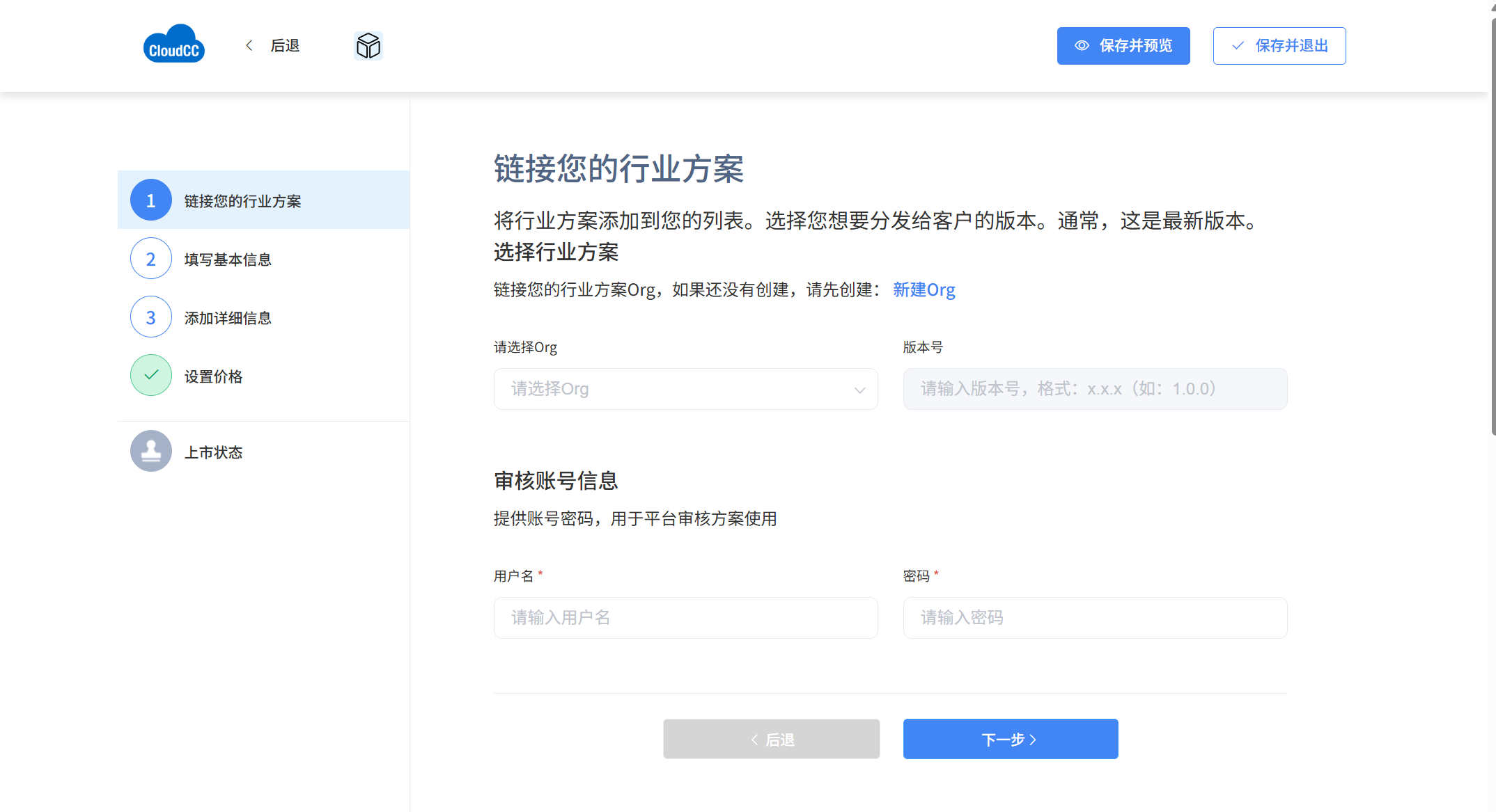 - 审核账号信息:填写的是申请的Org的用户名和密码(不是行业商城的用户名和密码),用于平台审核方案使用