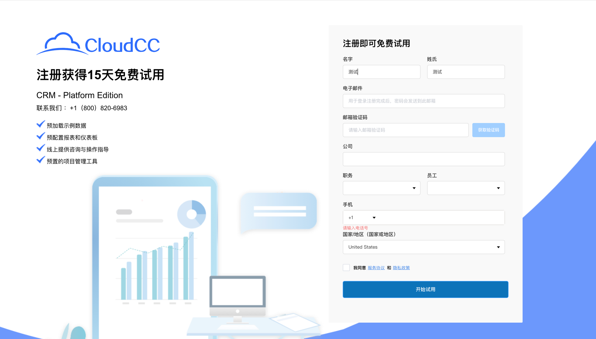 - 点击【新建Org】后跳转注册页面,填写完注册信息,点击【开始试用】。