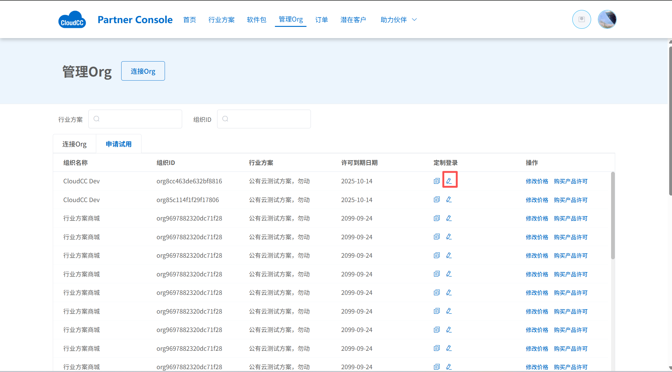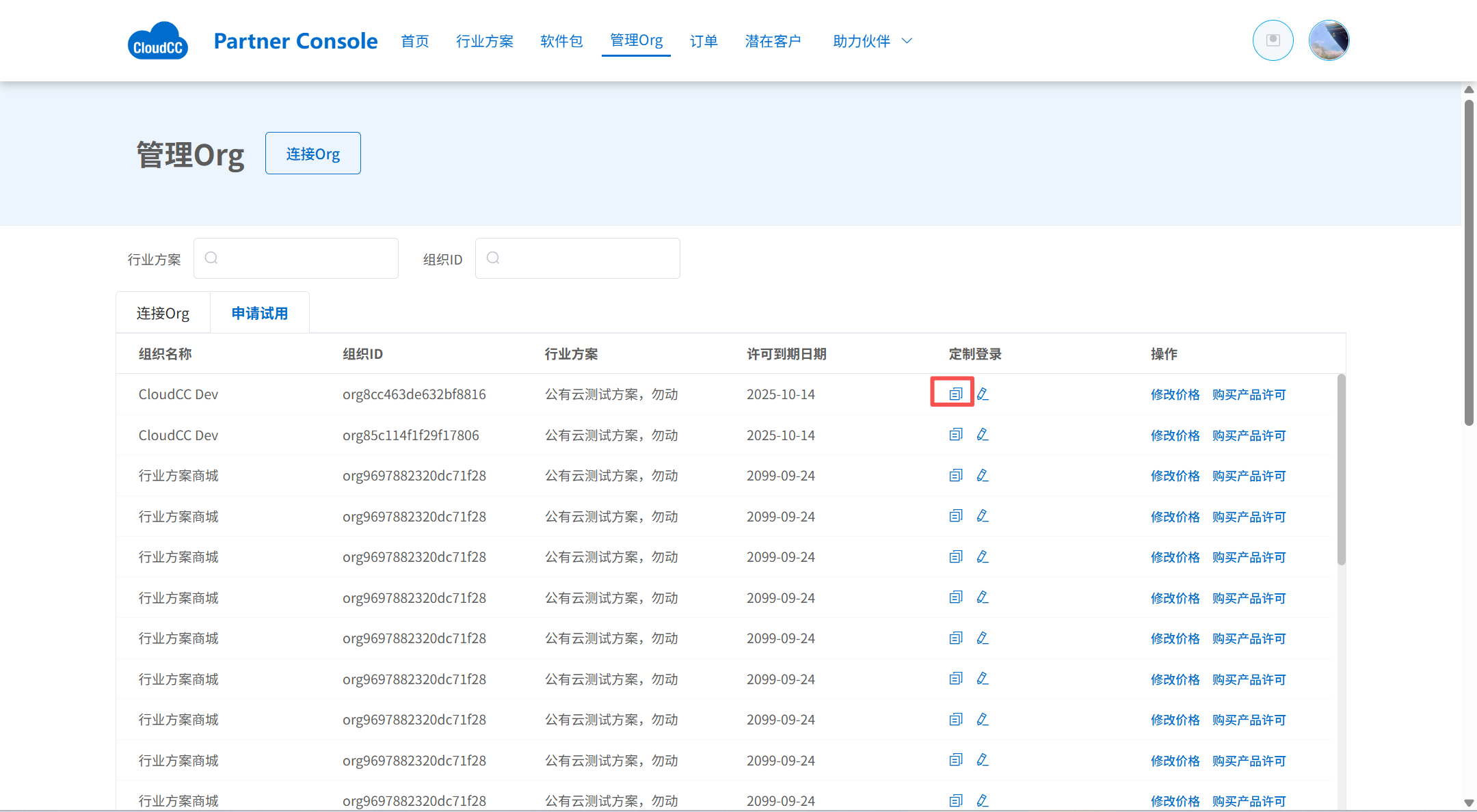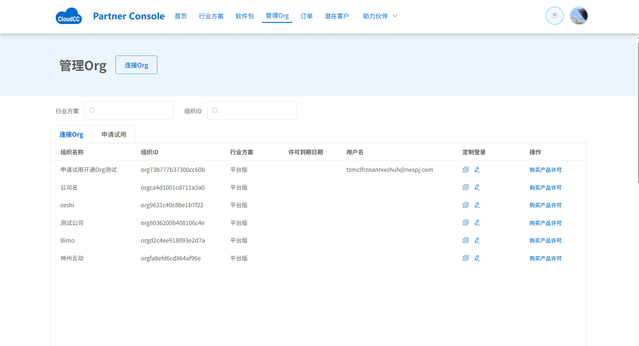 - 可查看由伙伴创建或客户试用开通的所有Org