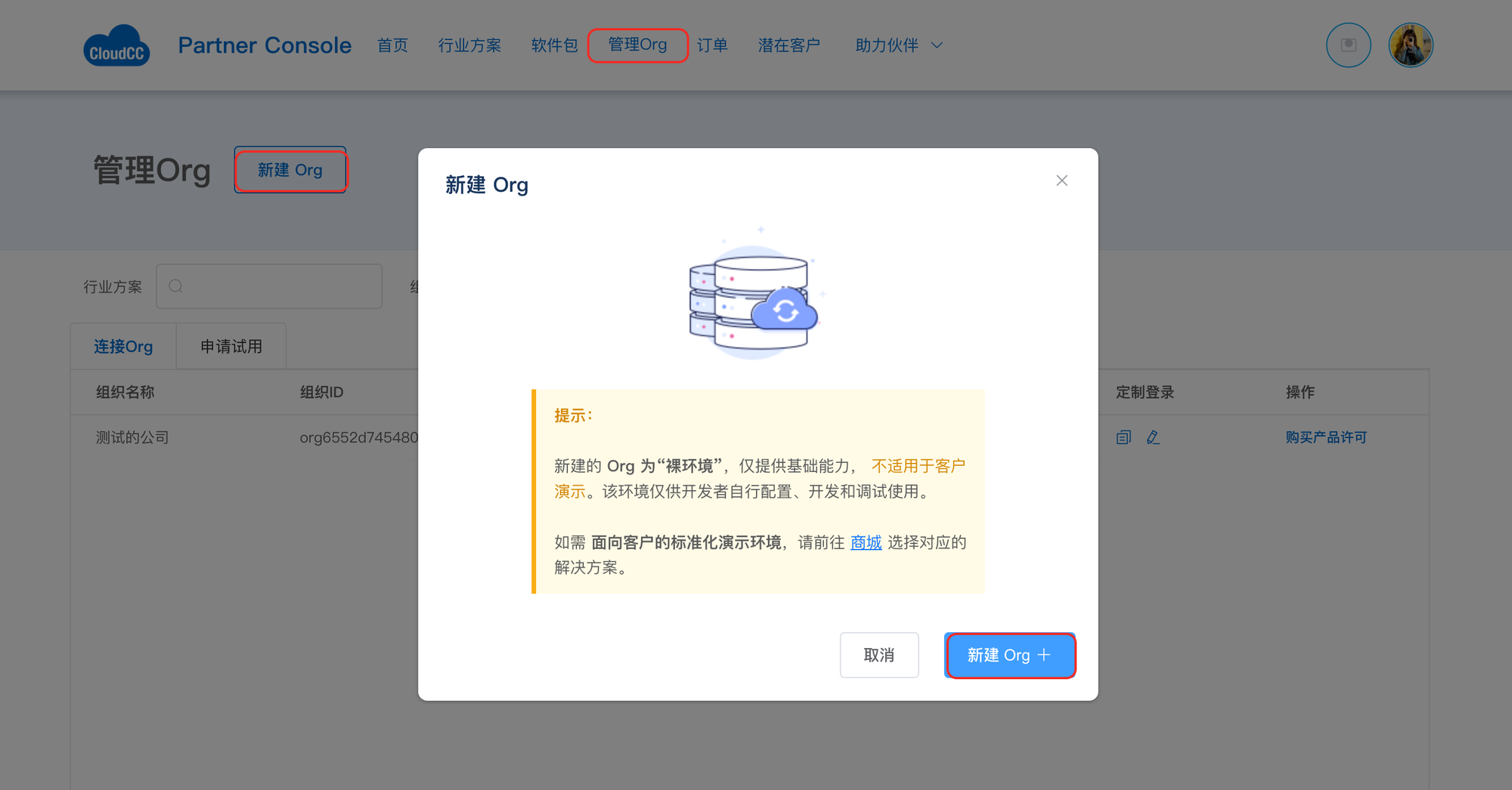 - 点击管理Org -> 新建org -> 弹窗后点击新建Org