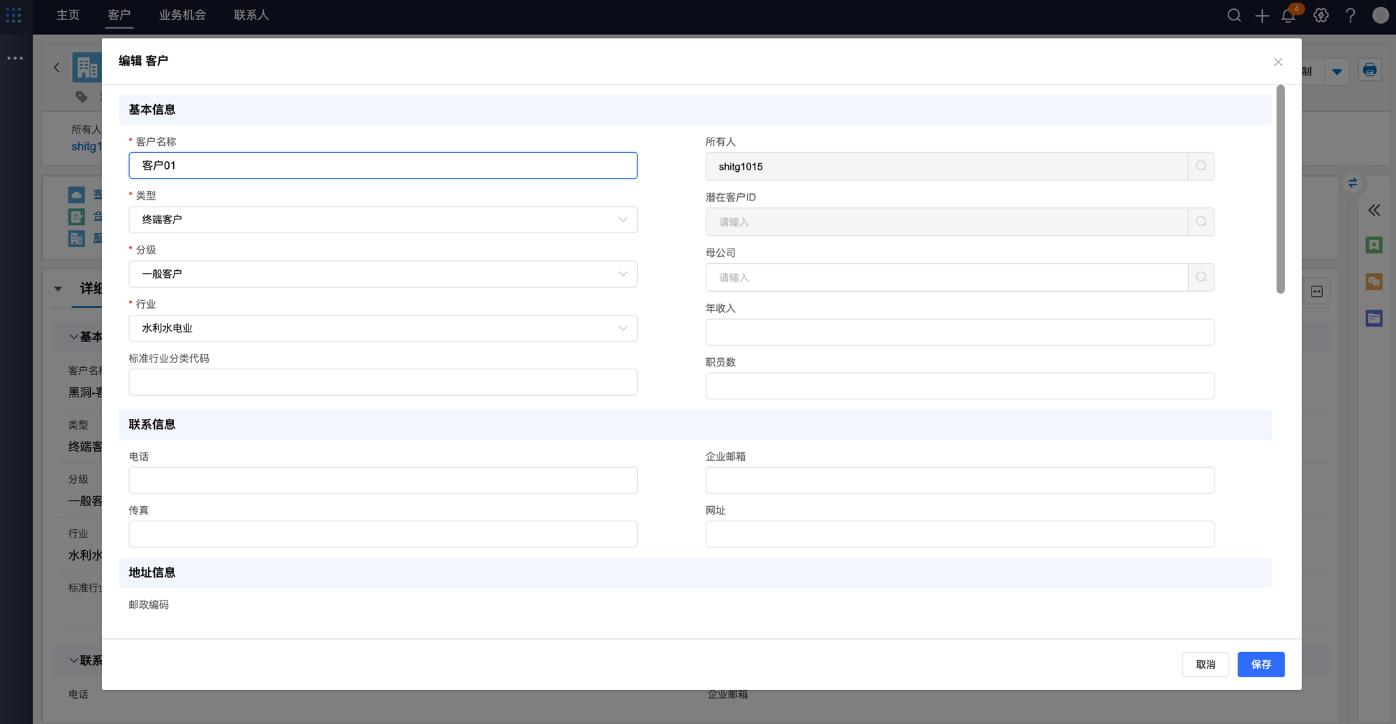 • 新建客户:点击【新建】,填写完必填字段,点击【保存】