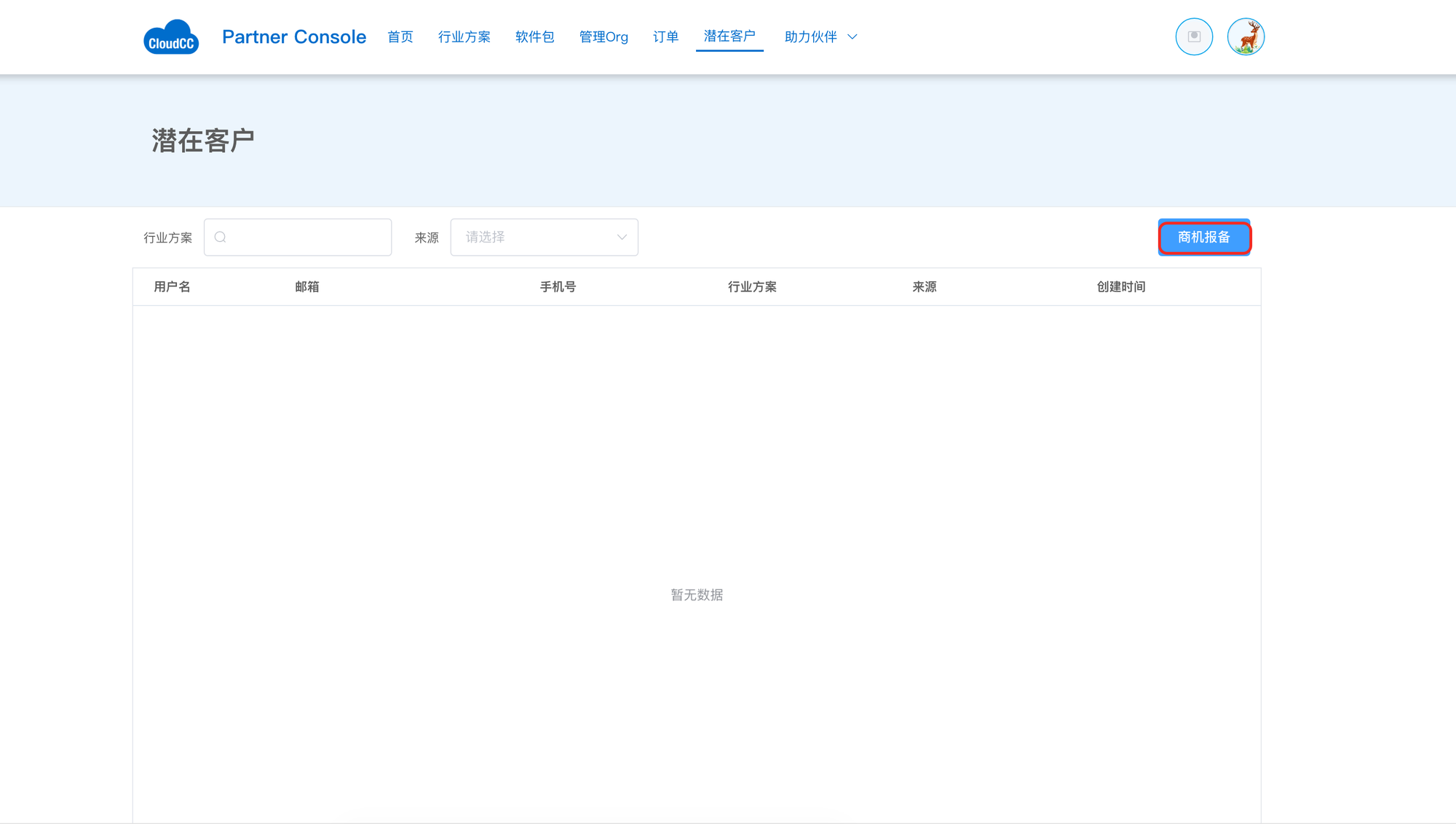商城用户登录后:进入伙伴门户 -> 潜在客户 -> 点击【商机报备】