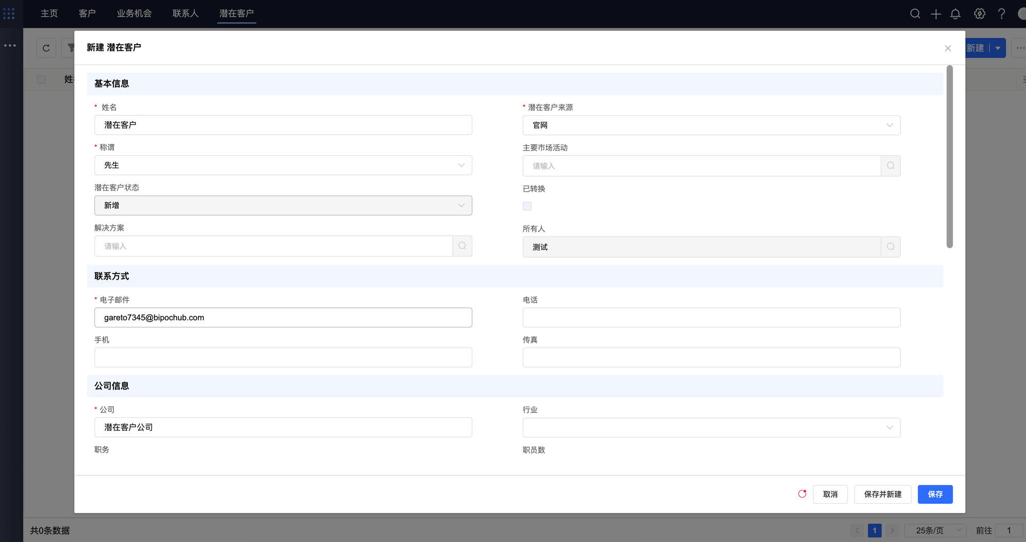 • 新建潜在客户:点击【新建】,填写完必填字段,点击【保存】
