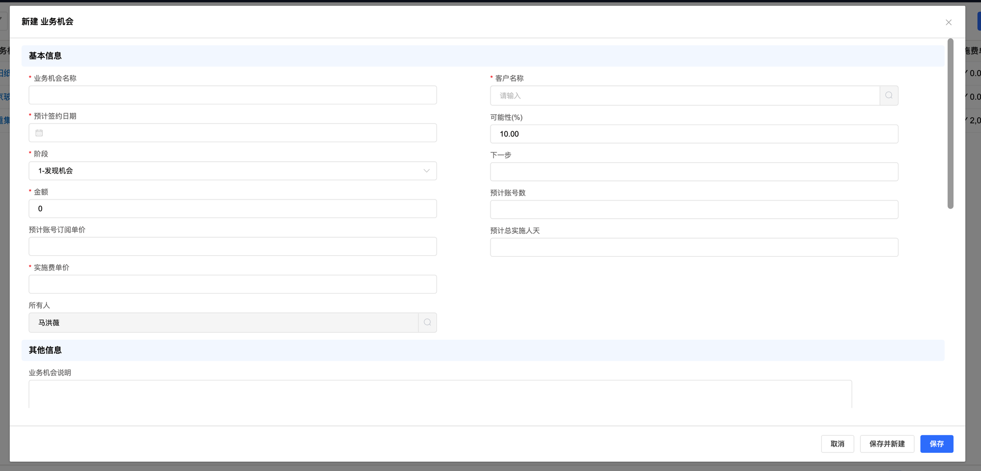 • 新建业务机会:点击【新建】,填写完必填字段,点击【保存】