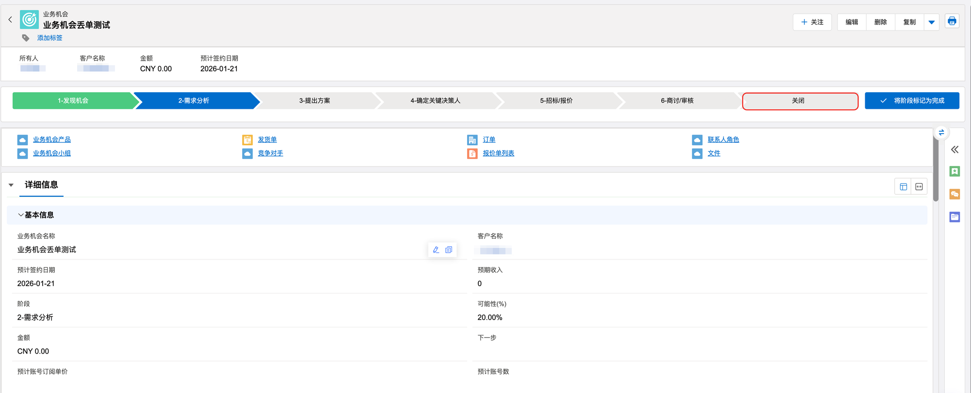 • 业务机会丢单:找到需要丢单的业务机会,进程的地方选择关闭,点击【将阶段标记未完成】