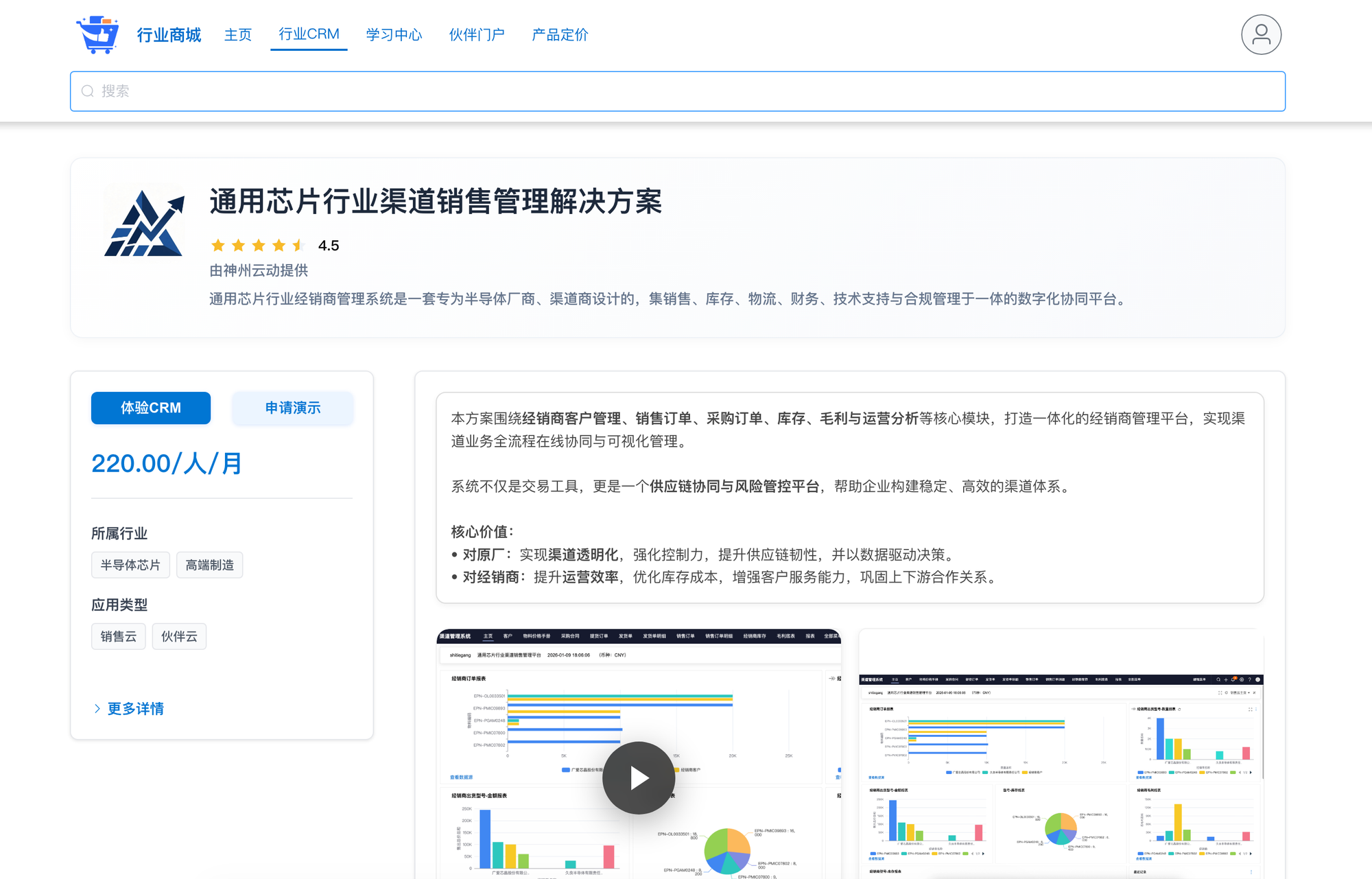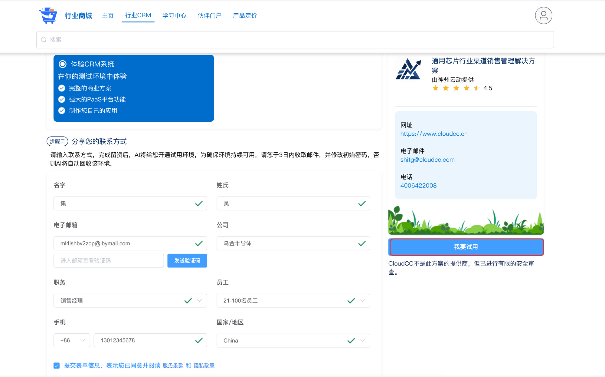 生态商城 申请试用行业方案 1、试用行业方案找到试用的行业方案:可以在行业CRM 上方进行搜索。找到方案后点击进入详情点击【体验CRM】进入申请页面填写联系方式内容:姓名、电子邮箱、公式、手机号,点击【我要试用】注意:电子邮箱需要保证在CloudCC系统中未使用过。点击试用后系统开始构建方案构建成功后会自动跳转至系统,并且会向您的注册邮箱发送一个完成注册的验证邮件打开邮箱,点击【确认账户】后跳转到修改密码页面,修改成功后即可使用邮箱与密码进行登录。 Previous Next