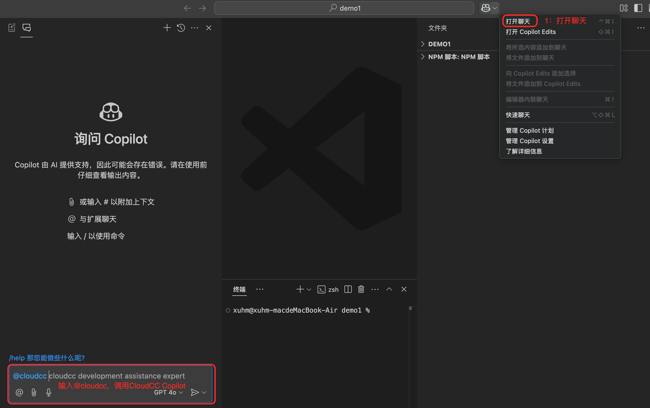 - 打开vs code,进入GitHub Copilot Chat,模型选择GPT 4o,通过@符,访问cloudcc助手。