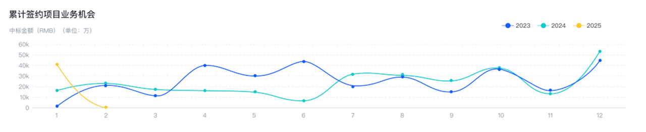 并使用自定义组件将自定义类中统计的数据,通过折线图展示出来。横轴代表月份(1-12月),纵轴代表中标金额(单位:万)。其中 2023 年用蓝色,2024 年用青色,2025 年用黄色。提示词模版